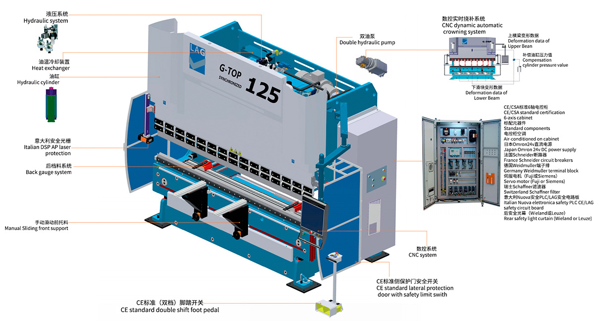 LAG與世界的數控系統生產商ESA合作,配置現代電子信息控制技術與折彎機行業新應用技術相結合的數控系統一ESA 550PC,使操作者很容易快速實現各種不同形狀、不同條件下的編程、校準以及折彎。